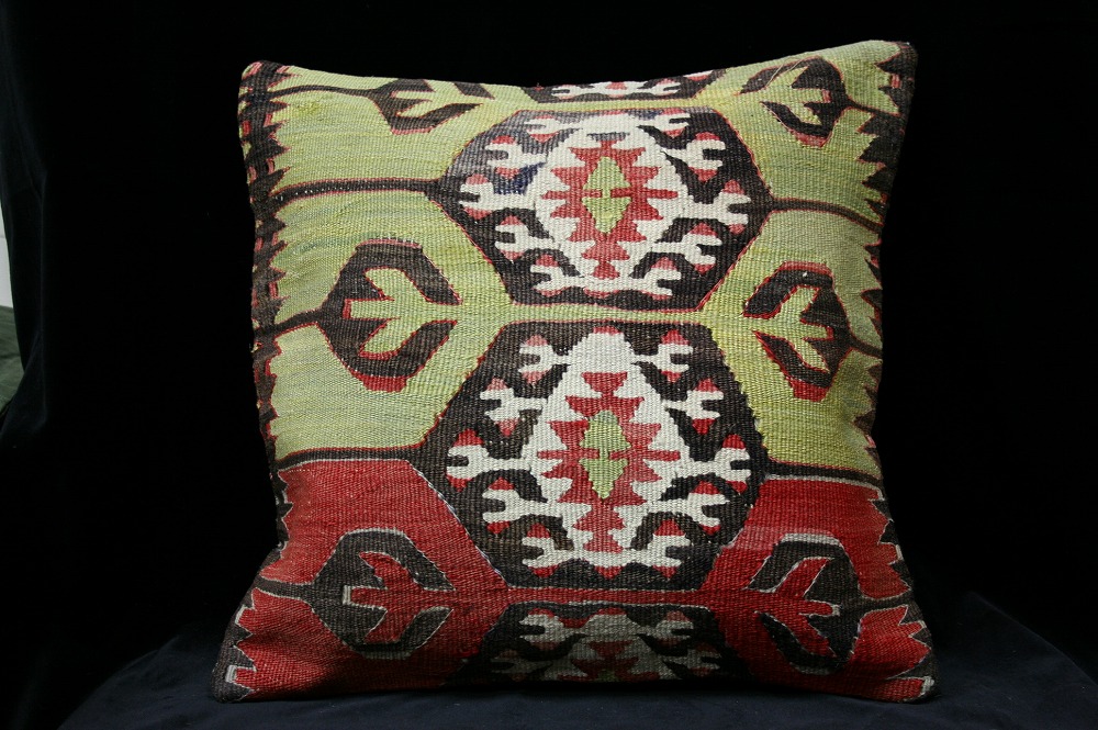 オールドキリムを使用して作られた、エキゾチックなクッションカバー。オールドキリムの素敵な部分をカットして使用されています。(表面はオールドキリム、裏側はコットンの布地です)お手持ちの家具やキリムと組み合わせてお楽しみください。このタイプのものは、なかなか数が少な く、品質・価格・品揃え共に日本国内屈指であると自負しています。この商品は現地でクリーニングしてから輸入していますのでご安心ください。
