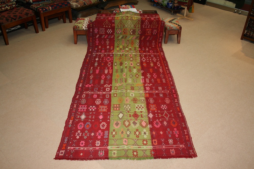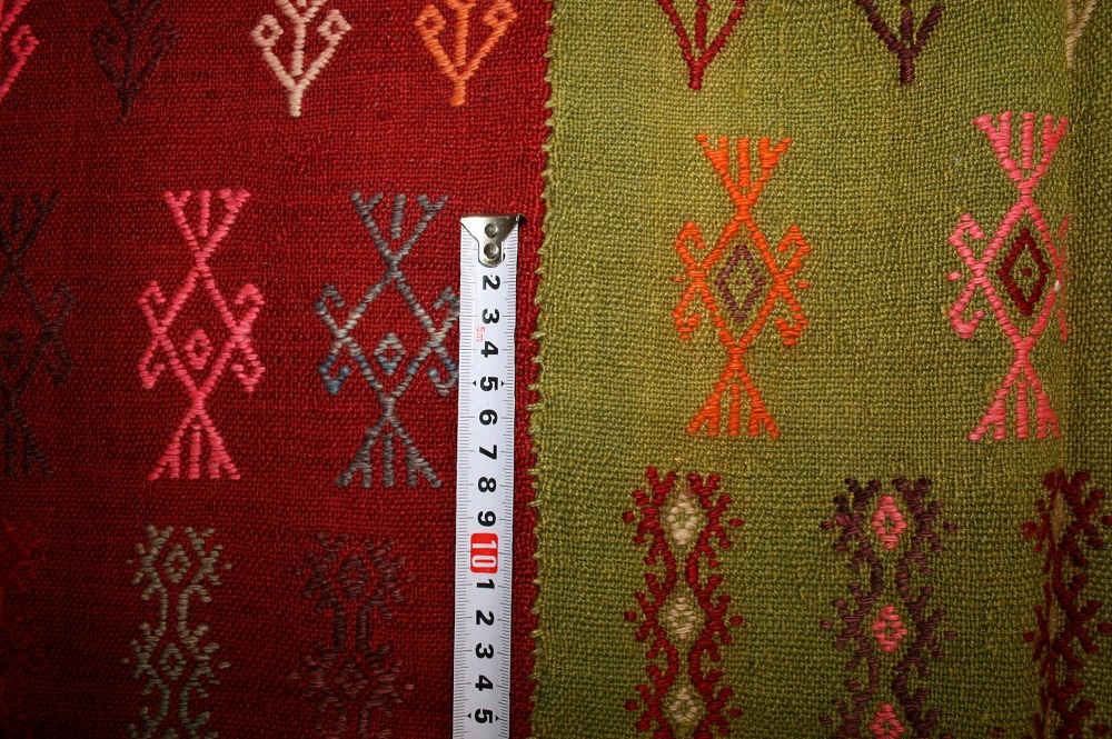 60~70年前のものです。繊細な織りと、大胆なデザインデと色彩。一枚あるだけで、オリジナリティあふれる空間をつくり出してくれます。本キリムに使用の糸は、すべて草木染めです。機械織りとは異なり、暖かみが伝わるハンドメイドです。