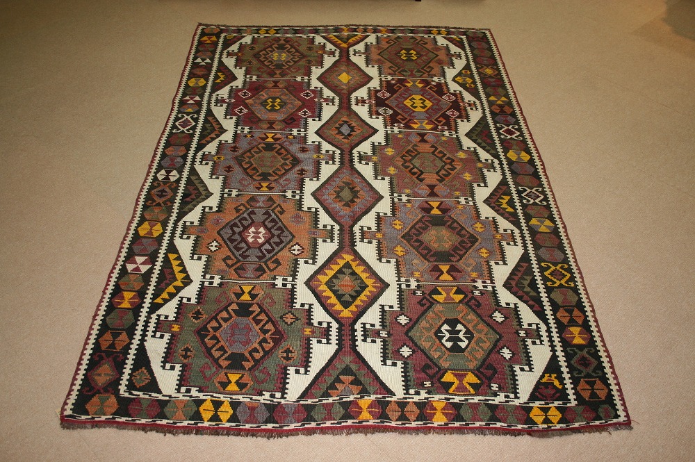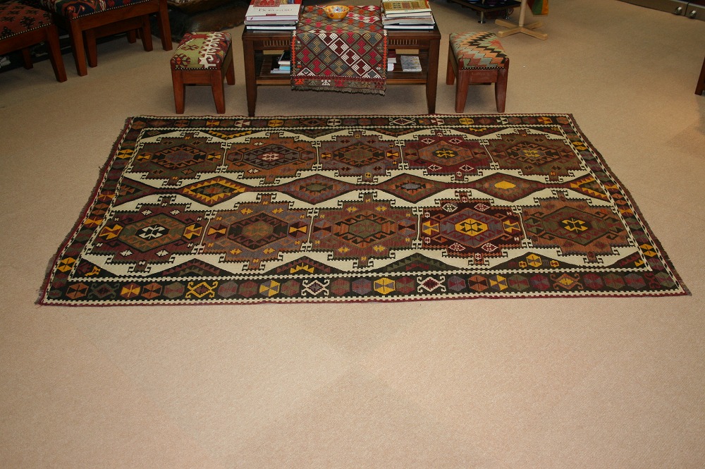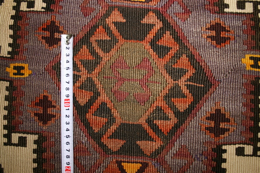 60~70年前のものです。繊細な織りと、大胆なデザインデと色彩。一枚あるだけで、オリジナリティあふれる空間をつくり出してくれます。本キリムに使用の糸は、すべて草木染めです。機械織りとは異なり、暖かみが伝わるハンドメイドです。