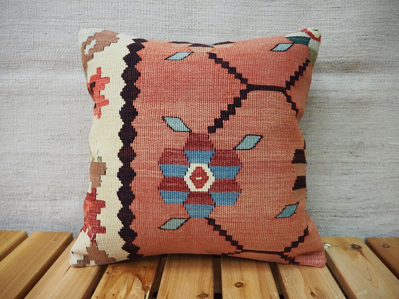 キリムクッションカバーオールドキリムを使用して作られた、エキゾチックなクッションカバー。オールドキリムの素敵な部分をカットして使用されています。(表面はオールドキリム、裏側はコットンの布地です)お手持ちの家具やキリムと組み合わせてお楽しみください。このタイプのものは、なかなか数が少な く、品質・価格・品揃え共に日本国内屈指であると自負しています。