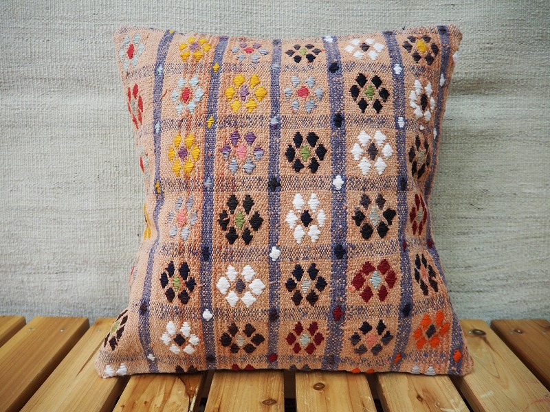 キリムクッションカバーオールドキリムを使用して作られた、エキゾチックなクッションカバー。オールドキリムの素敵な部分をカットして使用されています。(表面はオールドキリム、裏側はコットンの布地です)お手持ちの家具やキリムと組み合わせてお楽しみください。このタイプのものは、なかなか数が少な く、品質・価格・品揃え共に日本国内屈指であると自負しています。