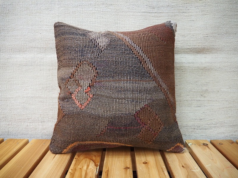 キリムクッションカバーオールドキリムを使用して作られた、エキゾチックなクッションカバー。オールドキリムの素敵な部分をカットして使用されています。(表面はオールドキリム、裏側はコットンの布地です)お手持ちの家具やキリムと組み合わせてお楽しみください。このタイプのものは、なかなか数が少な く、品質・価格・品揃え共に日本国内屈指であると自負しています。