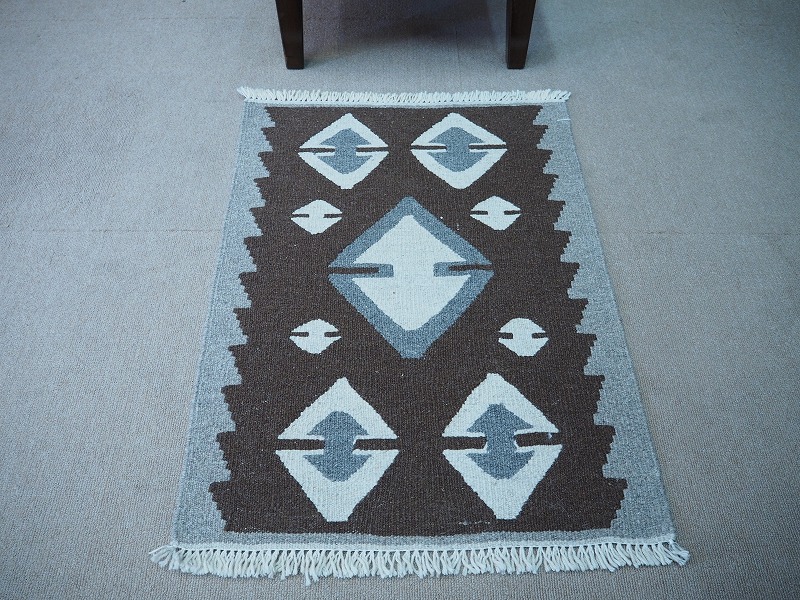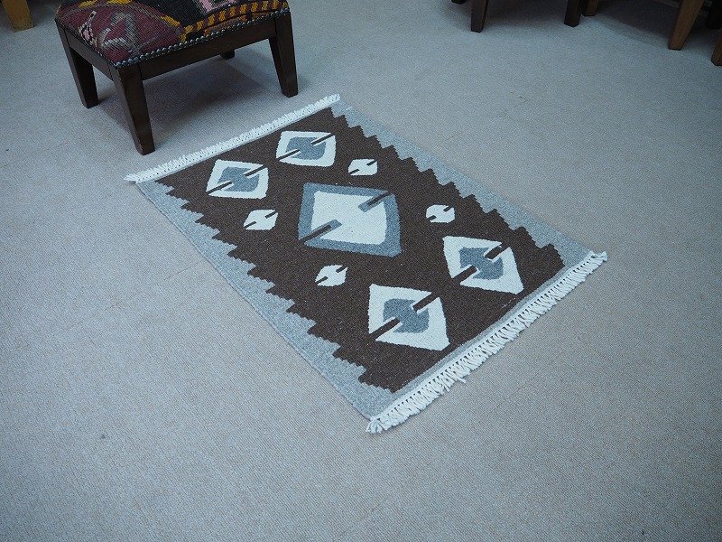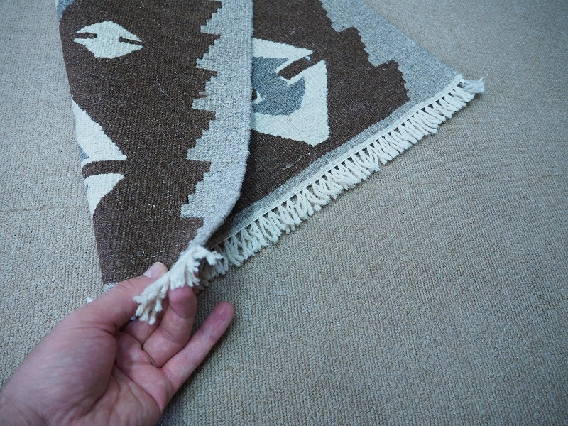 染めていないナチュラルな羊の毛の色だけを使って織られたモノトーンのキリム。こげ茶色、茶色、グレー、ベージュ、オフホワイトの組み合わせて、伝統的なキリムになっています。モダンなお部屋にもあわせやすい人気のカラーです。織りは、細かく隙間のない状態になっています。
