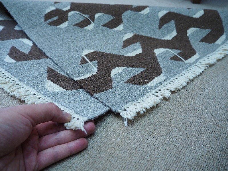 染めていないナチュラルな羊の毛の色だけを使って織られたモノトーンのキリム。こげ茶色、茶色、グレー、ベージュ、オフホワイトの組み合わせて、伝統的なキリムになっています。モダンなお部屋にもあわせやすい人気のカラーです。織りは、細かく隙間のない状態になっています。