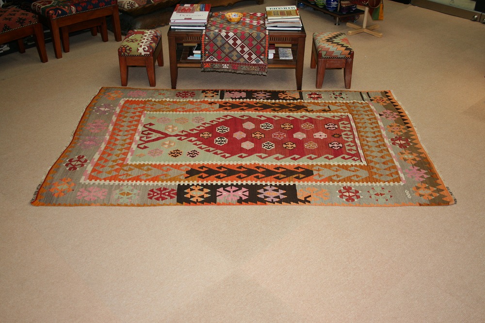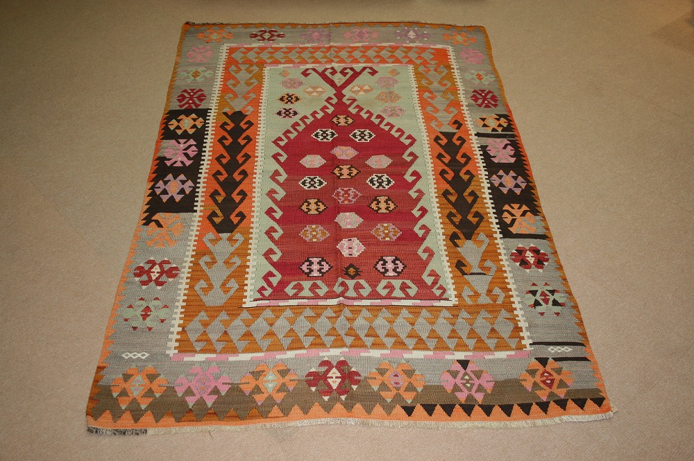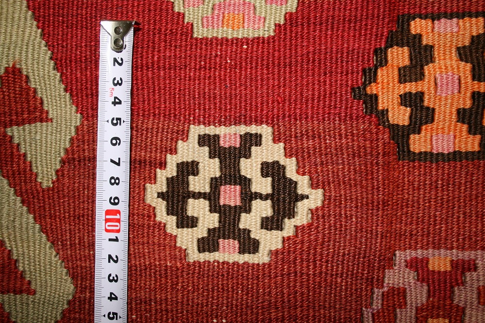 50~60年前のものです。繊細な織りと、大胆なデザインデと色彩。一枚あるだけで、オリジナリティあふれる空間をつくり出してくれます。本キリムに使用の糸は、すべて草木染めです。機械織りとは異なり、暖かみが伝わるハンドメイドです。