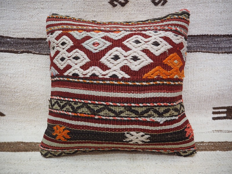 キリムクッションカバーオールドキリムを使用して作られた、エキゾチックなクッションカバー。オールドキリムの素敵な部分をカットして使用されています。(表面はオールドキリム、裏側はコットンの布地です)お手持ちの家具やキリムと組み合わせてお楽しみください。このタイプのものは、なかなか数が少な く、品質・価格・品揃え共に日本国内屈指であると自負しています。