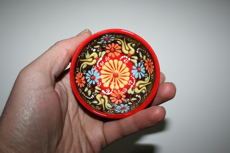 女流陶芸家“ニメット(Nimet)さん”の作品です。トルコの国花チューリップ、カーネーションなどのカラフルなデザインが特徴です。アクセサリー・お菓子入れ、フルーツを盛ったりと使い道はさまざま。もちろんインテリアとしてもお楽しみいただけます。見ているだけでも気持ちが華やぎ、楽しくなる作品です。
