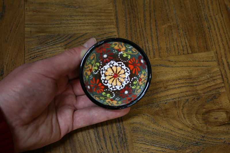女流陶芸家“ニメット(Nimet)さん”の作品です。トルコの国花チューリップ、カーネーションなどのカラフルなデザインが特徴です。アクセサリー・お菓子入れ、フルーツを盛ったりと使い道はさまざま。もちろんインテリアとしてもお楽しみいただけます。見ているだけでも気持ちが華やぎ、楽しくなる作品です。
