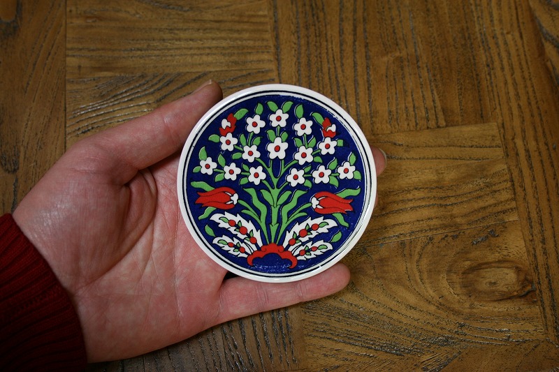 kabt289【新品】トルコ/プリントコースター,陶器で知られる町,トルコのキュタフヤで作られた、プリントコースター。ティーポットなどを置いていただいたり、プレートス タンドに立てて、インテリアとしてもお楽しみいただけます。 トルコ国花、カーネーションやチューリップのクラシカルなデザインが特徴です。