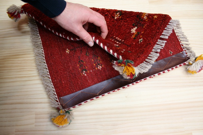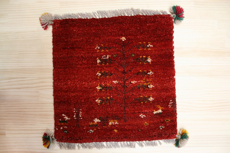 igb14922=ふわふわした毛足(パイル)で、手触りがいい手紬で手織りのギャッベ。40cm角のミニサイズは、玄関、ダイニングや普段座る椅子、車の座席の座布団代わりにおすすめです。手織りならではの一枚一枚違った感触をお楽しみください。