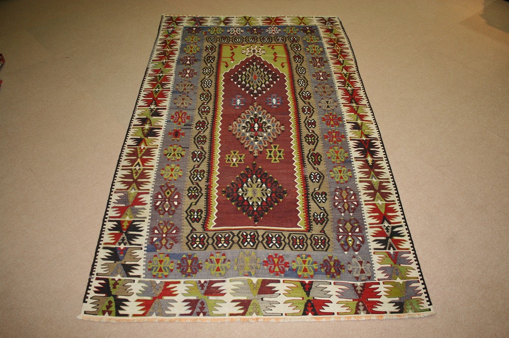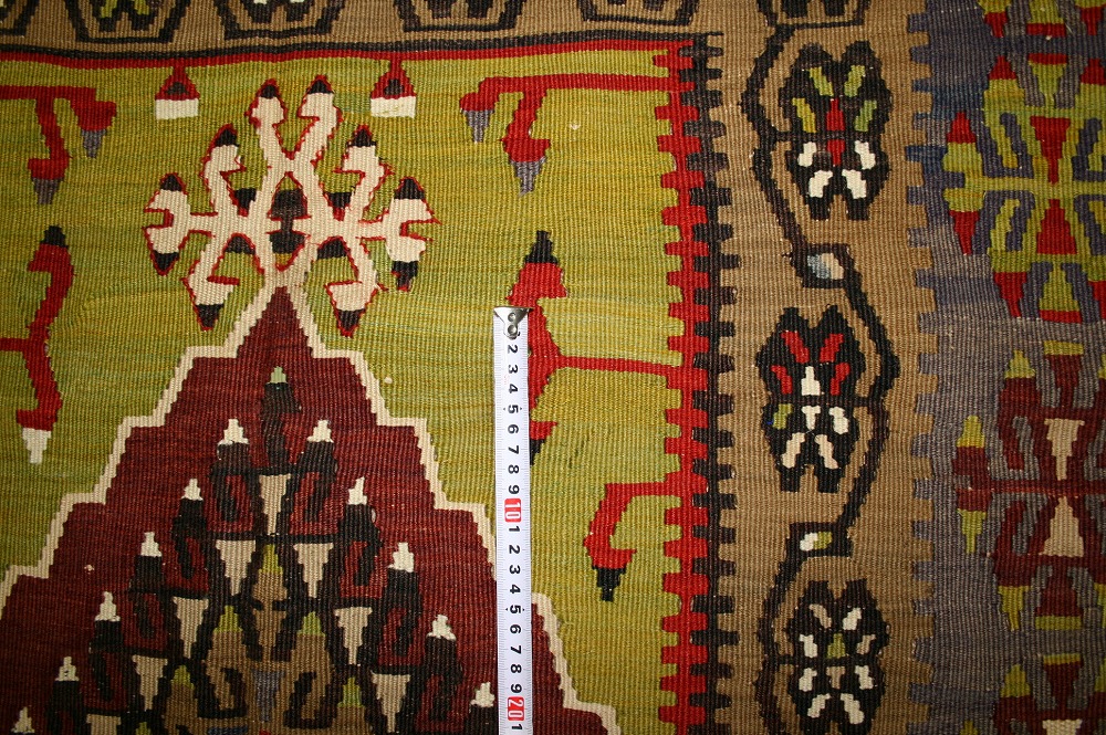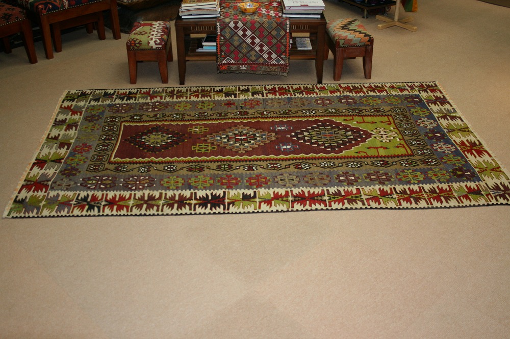 60~70年前のものです。繊細な織りと、大胆なデザインデと色彩。一枚あるだけで、オリジナリティあふれる空間をつくり出してくれます。本キリムに使用の糸は、すべて草木染めです。機械織りとは異なり、暖かみが伝わるハンドメイドです。