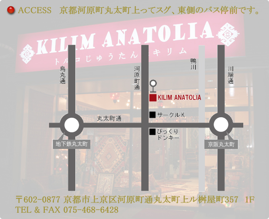 住所 〒602-0877 京都市上京区河原町通丸太町上ル桝屋町357 1F TEL&FAX 075-468-6428 E-mail kyoto@kilimanatolia.jp 営業時間 11:00 ~ 19:00 ※インターネットでのご注文、E-mail、FAXは24時間受付けております。