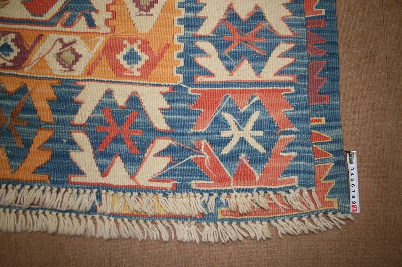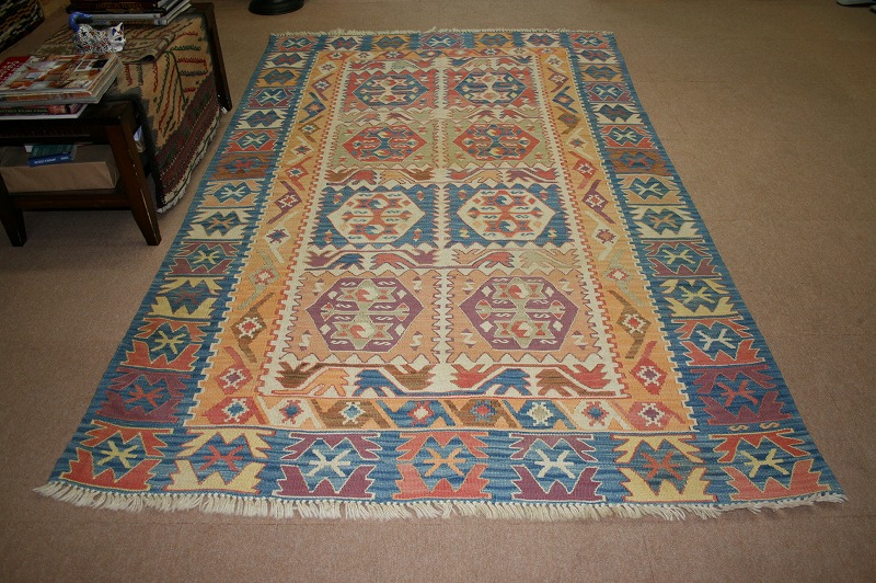 スタンダードキリムより、ワンランク上のカイセリキリム。カイセリ地方で織られているキリムです。上質のウールで織られているため、手触りもやわらか。細 かなモチーフがぎっしり詰め込まれ、繊細に織られていて、古いキリムの色合いに合わせたパステル調の色合いが特徴です。機械織りとは異なり、暖かみが伝わ るハンドメイド。正方形のキリムはめずらしく、この大きさのキリムは日本向けに作ってもらったものです!ホットカーペットの上にいかがでしょうか。このタ イプのものは、なかなか数が少なく、品質・価格・品揃え共に、日本国内屈指であると自負しています。