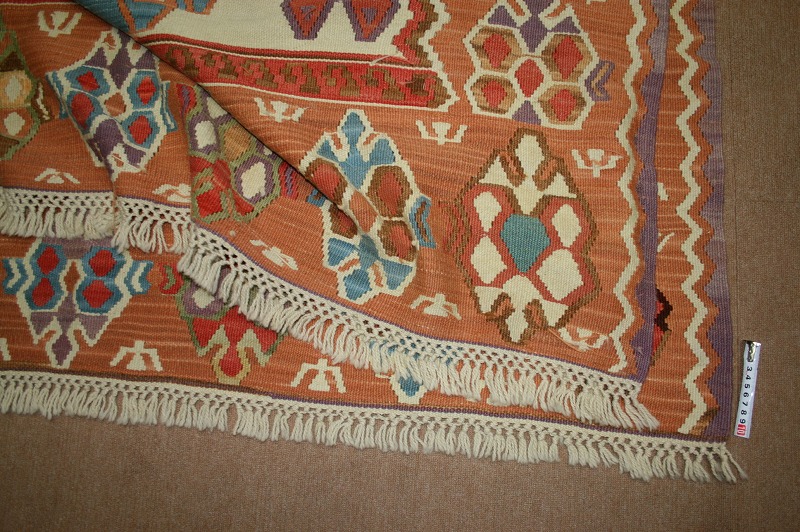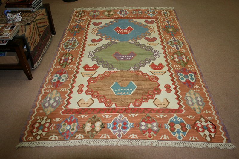 スタンダードキリムより、ワンランク上のカイセリキリム。カイセリ地方で織られているキリムです。上質のウールで織られているため、手触りもやわらか。細 かなモチーフがぎっしり詰め込まれ、繊細に織られていて、古いキリムの色合いに合わせたパステル調の色合いが特徴です。機械織りとは異なり、暖かみが伝わ るハンドメイド。正方形のキリムはめずらしく、この大きさのキリムは日本向けに作ってもらったものです!ホットカーペットの上にいかがでしょうか。このタ イプのものは、なかなか数が少なく、品質・価格・品揃え共に、日本国内屈指であると自負しています。