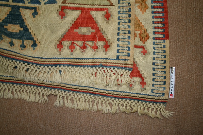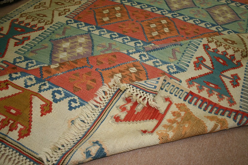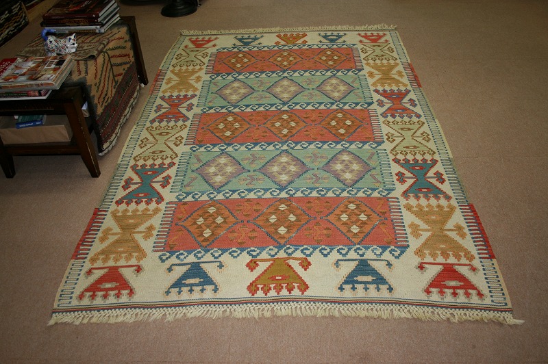 スタンダードキリムより、ワンランク上のカイセリキリム。カイセリ地方で織られているキリムです。上質のウールで織られているため、手触りもやわらか。細 かなモチーフがぎっしり詰め込まれ、繊細に織られていて、古いキリムの色合いに合わせたパステル調の色合いが特徴です。機械織りとは異なり、暖かみが伝わ るハンドメイド。正方形のキリムはめずらしく、この大きさのキリムは日本向けに作ってもらったものです!ホットカーペットの上にいかがでしょうか。このタ イプのものは、なかなか数が少なく、品質・価格・品揃え共に、日本国内屈指であると自負しています。