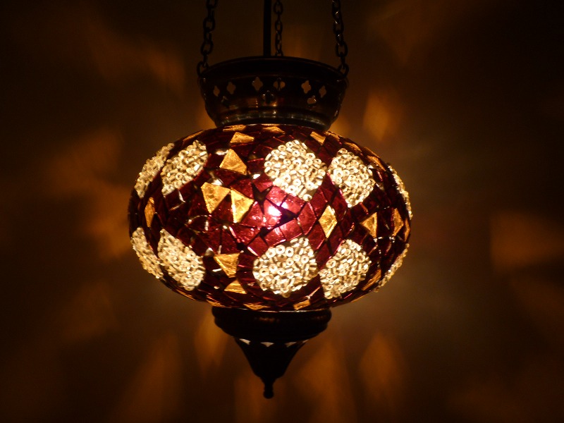 豪華で美麗なあかりを、あなたのお部屋に!古くからトルコに伝わる、伝統のデザイン、モザイクタイルを手作業で施したハンドメイド。そしてこのリーズナブルなプライス、どれをとっても大満足!お隣に差がつく、世界に1つの逸品です。ランプの付け方について