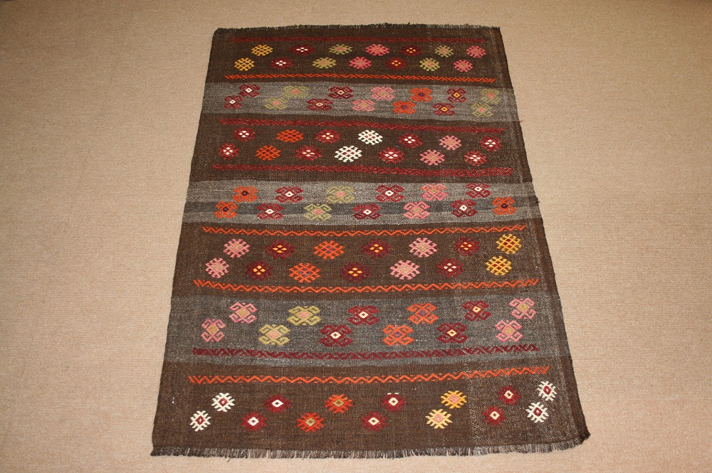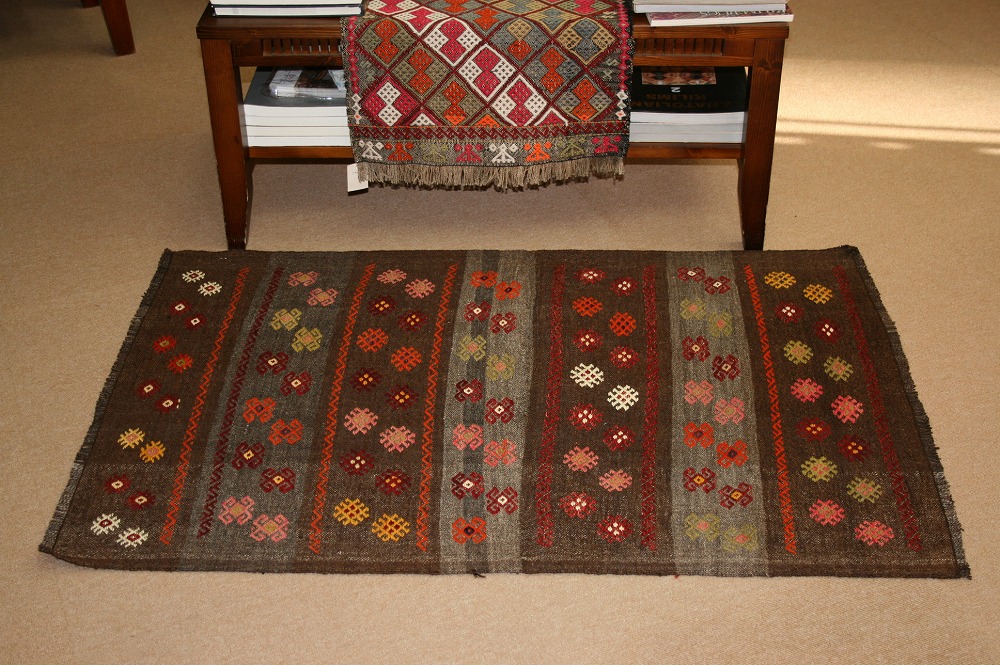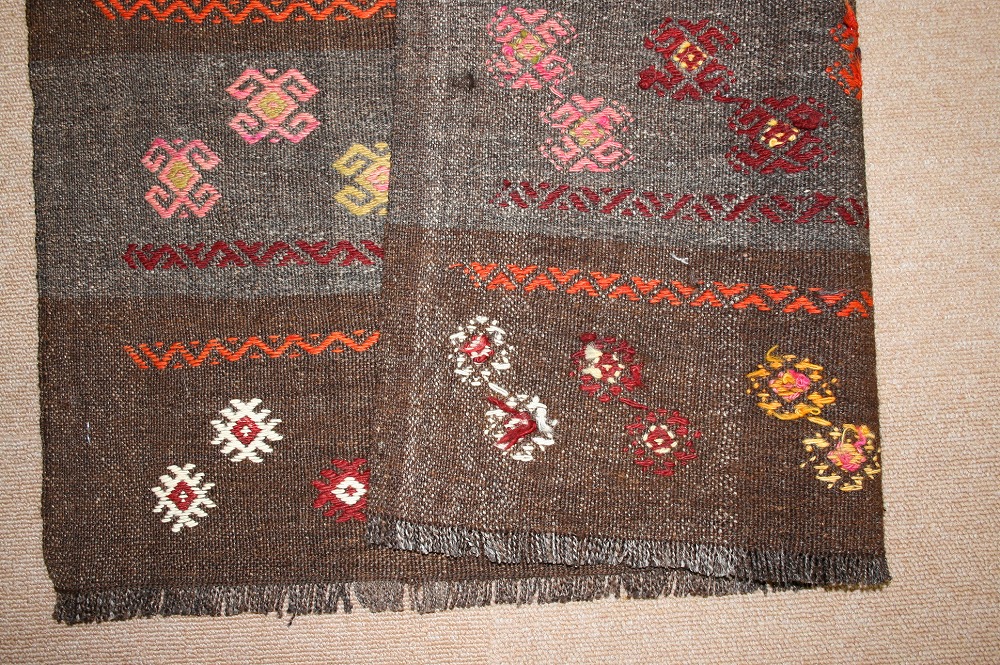 織ってから40~50年経っていますがきれいな状態を保っています。古いキリムですので、色に味があり、手触りもやわらかくなってきています。サイズ的に壁に飾ってもいい感じです。