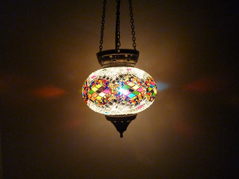 豪華で美麗なあかりを、あなたのお部屋に!古くからトルコに伝わる、伝統のデザイン、モザイクタイルを手作業で施したハンドメイド。そしてこのリーズナブルなプライス、どれをとっても大満足!お隣に差がつく、世界に1つの逸品です。ランプの付け方について