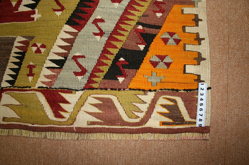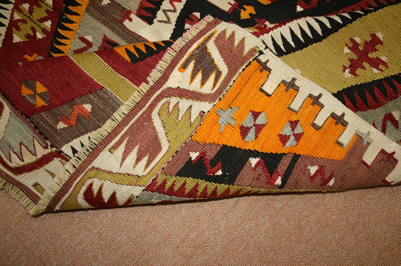 50~60年前のものです。繊細な織りと、大胆なデザインデと色彩。一枚あるだけで、オリジナリティあふれる空間をつくり出してくれます。本キリムに使用の糸は、すべて草木染めです。機械織りとは異なり、暖かみが伝わるハンドメイドです。使われた様子はなく、ほとんどダメージはありません。ふさの根元の部分は、横糸が出てこないように丁寧に仕上げています。リーズナブルなプライスでご満足いただけると思います。