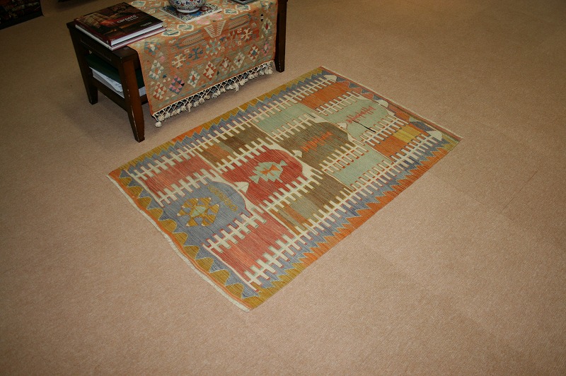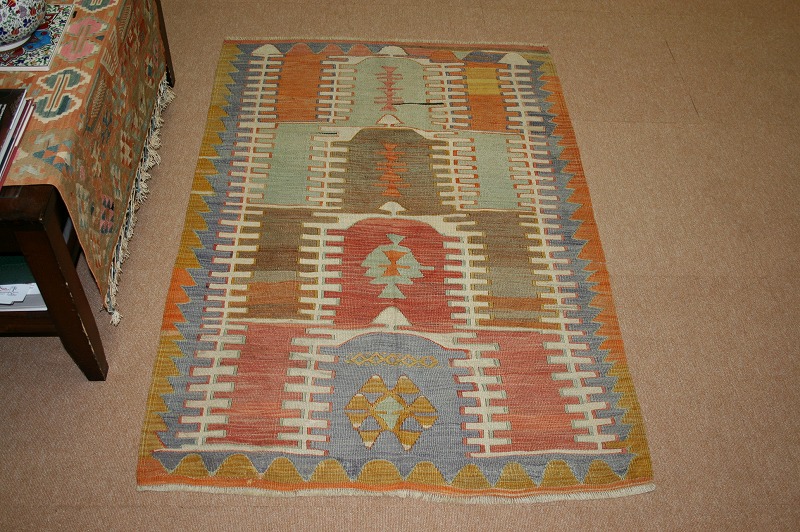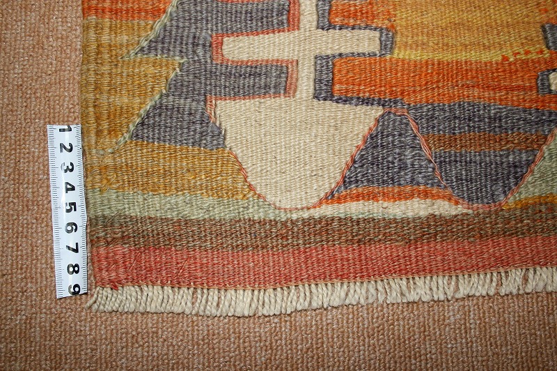 50~60年前のものです。繊細な織りと、大胆なデザインデと色彩。一枚あるだけで、オリジナリティあふれる空間をつくり出してくれます。本キリムに使用の糸は、すべて草木染めです。機械織りとは異なり、暖かみが伝わるハンドメイドです。使われた様子はなく、ほとんどダメージはありません。ふさの根元の部分は、横糸が出てこないように丁寧に仕上げています。リーズナブルなプライスでご満足いただけると思います。