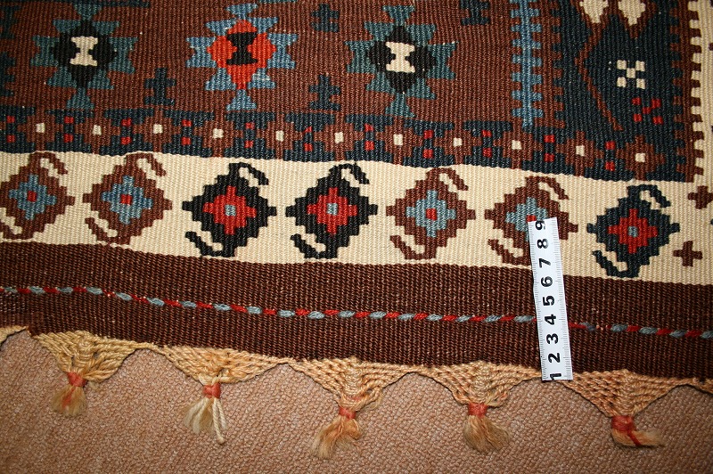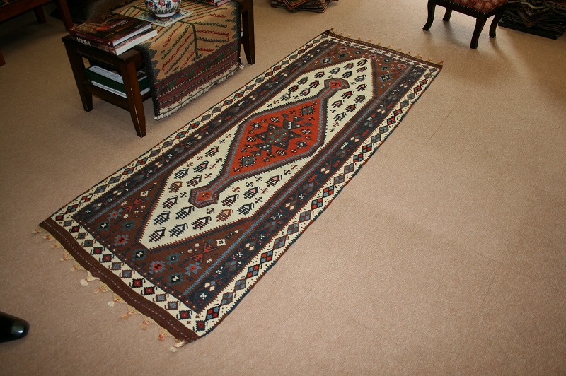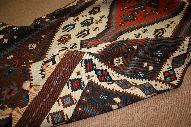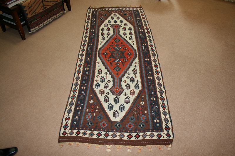 オールドキリム 60~70年前のものです。繊細な織りと、大胆なデザインデと色彩。一枚あるだけで、オリジナリティあふれる空間をつくり出してくれます。本キリムに使用の糸は、すべて草木染めです。機械織りとは異なり、暖かみが伝わるハンドメイドです。使われた様子はなく、ほとんどダメージはありません。ふさの根元の部分は、横糸が出てこないように丁寧に仕上げています。リーズナブルなプライスでご満足いただけると思います。