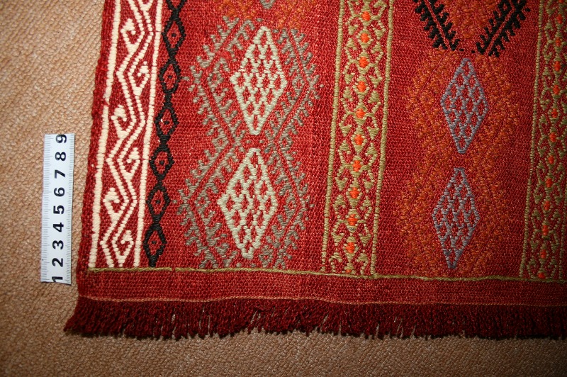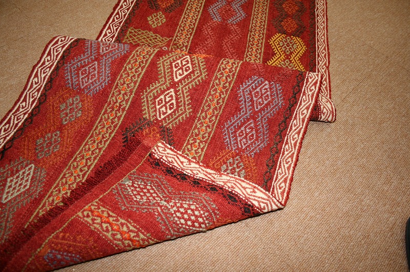 オールドキリム 40~50年前のものです。繊細な織りと、大胆なデザインデと色彩。一枚あるだけで、オリジナリティあふれる空間をつくり出してくれます。本キリムに使用の糸は、すべて草木染めです。機械織りとは異なり、暖かみが伝わるハンドメイドです。使われた様子はなく、ダメージはありません。サイズ的に壁に飾ってもいい感じです。ふさの根元の部分は、横糸が出てこないように丁寧に仕上げています。リーズナブルなプライスでご満足いただけると思います。