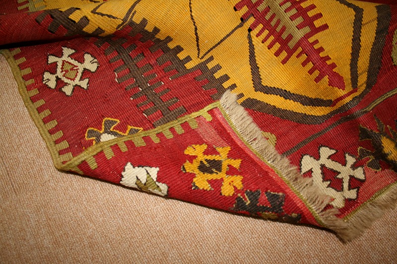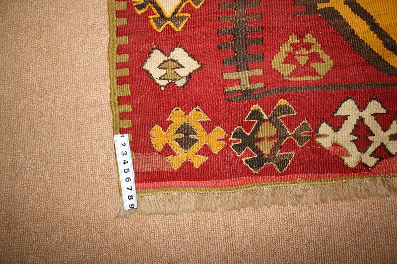 50~60年前のものです。繊細な織りと、大胆なデザインデと色彩。一枚あるだけで、オリジナリティあふれる空間をつくり出してくれます。本キリムに使用の糸は、すべて草木染めです。機械織りとは異なり、暖かみが伝わるハンドメイドです。使われた様子はなく、ほとんどダメージはありません。ふさの根元の部分は、横糸が出てこないように丁寧に仕上げています。リーズナブルなプライスでご満足いただけると思います。