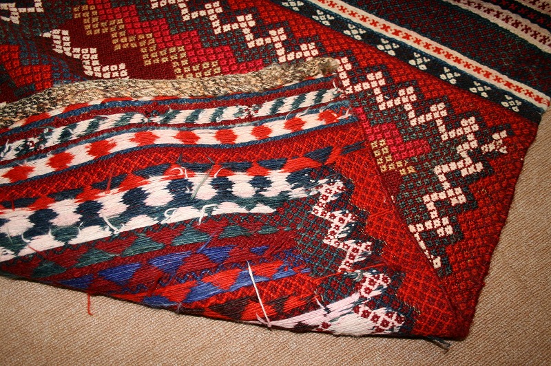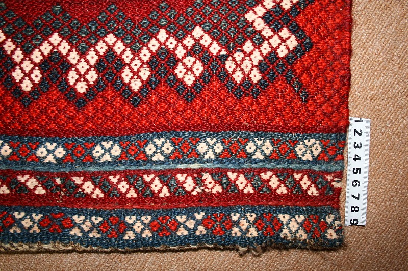 オールドキリムジジム 60~70年前のものです。繊細な織りと、大胆なデザインデと色彩。一枚あるだけで、オリジナリティあふれる空間をつくり出してくれます。本キリムに使用の糸は、すべて草木染めです。機械織りとは異なり、暖かみが伝わるハンドメイドです。使われた様子はなく、ほとんどダメージはありません。ふさの根元の部分は、横糸が出てこないように丁寧に仕上げています。リーズナブルなプライスでご満足いただけると思います。