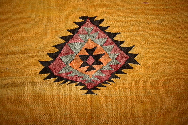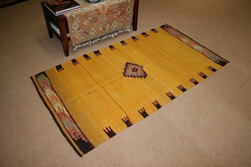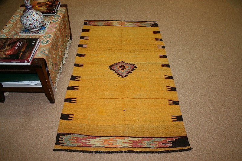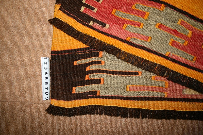 50~60年前のものです。繊細な織りと、大胆なデザインデと色彩。一枚あるだけで、オリジナリティあふれる空間をつくり出してくれます。本キリムに使用の糸は、すべて草木染めです。機械織りとは異なり、暖かみが伝わるハンドメイドです。使われた様子はなく、ほとんどダメージはありません。ふさの根元の部分は、横糸が出てこないように丁寧に仕上げています。リーズナブルなプライスでご満足いただけると思います。