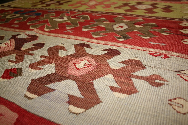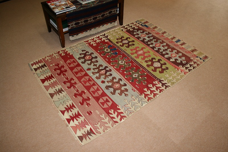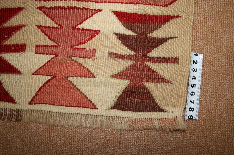 50~60年前のものです。繊細な織りと、大胆なデザインデと色彩。一枚あるだけで、オリジナリティあふれる空間をつくり出してくれます。本キリムに使用の糸は、すべて草木染めです。機械織りとは異なり、暖かみが伝わるハンドメイドです。使われた様子はなく、ほとんどダメージはありません。ふさの根元の部分は、横糸が出てこないように丁寧に仕上げています。リーズナブルなプライスでご満足いただけると思います。