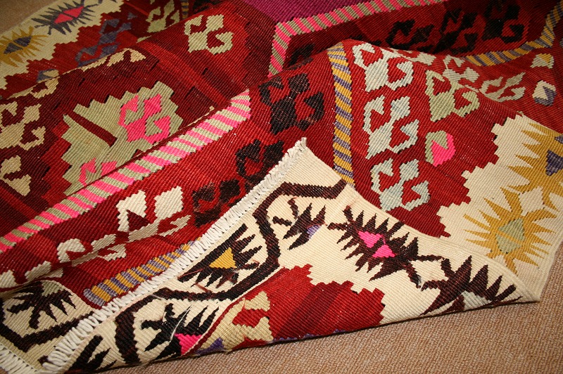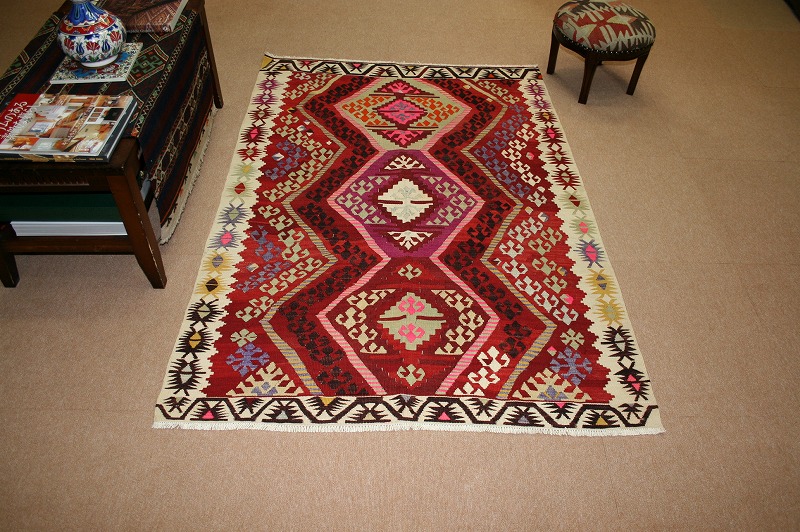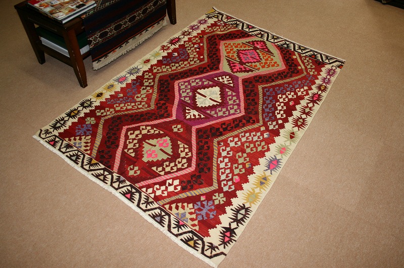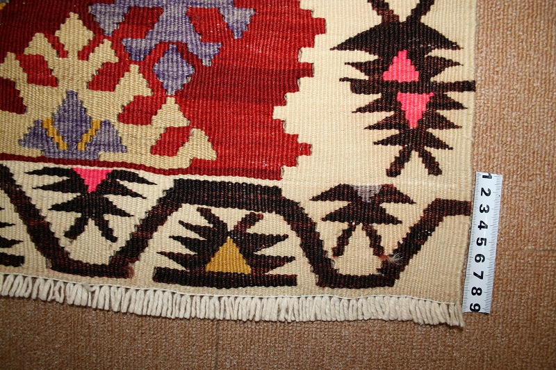 50~60年前のものです。繊細な織りと、大胆なデザインデと色彩。一枚あるだけで、オリジナリティあふれる空間をつくり出してくれます。本キリムに使用の糸は、すべて草木染めです。機械織りとは異なり、暖かみが伝わるハンドメイドです。使われた様子はなく、ほとんどダメージはありません。ふさの根元の部分は、横糸が出てこないように丁寧に仕上げています。リーズナブルなプライスでご満足いただけると思います。