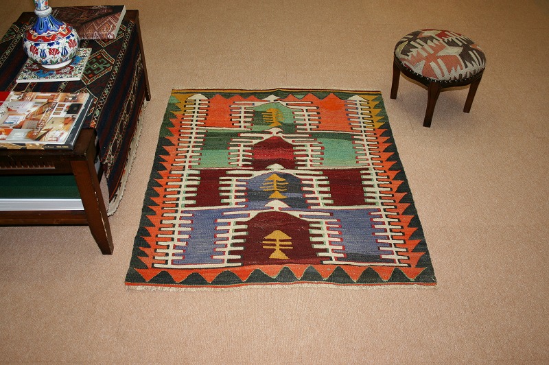 40~50年前のものです。繊細な織りと、大胆なデザインデと色彩。一枚あるだけで、オリジナリティあふれる空間をつくり出してくれます。本キリムに使用の糸は、すべて草木染めです。機械織りとは異なり、暖かみが伝わるハンドメイドです。使われた様子はなく、ほとんどダメージはありません。ふさの根元の部分は、横糸が出てこないように丁寧に仕上げています。リーズナブルなプライスでご満足いただけると思います。