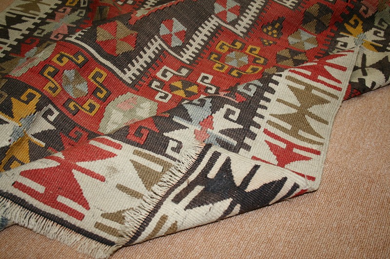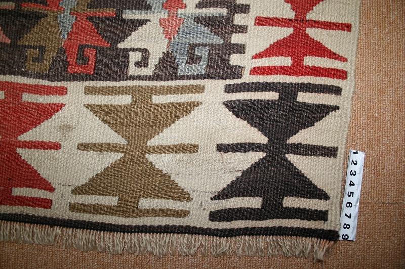 50~60年前のものです。繊細な織りと、大胆なデザインデと色彩。一枚あるだけで、オリジナリティあふれる空間をつくり出してくれます。本キリムに使用の糸は、すべて草木染めです。機械織りとは異なり、暖かみが伝わるハンドメイドです。使われた様子はなく、ほとんどダメージはありません。ふさの根元の部分は、横糸が出てこないように丁寧に仕上げています。リーズナブルなプライスでご満足いただけると思います。