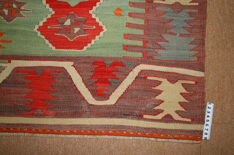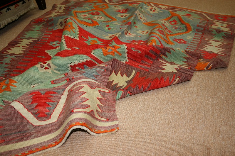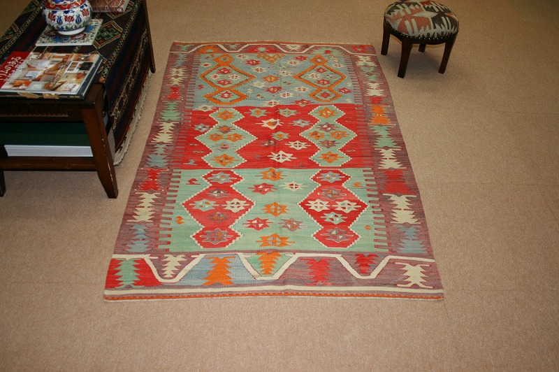50~60年前のものです。繊細な織りと、大胆なデザインデと色彩。一枚あるだけで、オリジナリティあふれる空間をつくり出してくれます。本キリムに使用の糸は、すべて草木染めです。機械織りとは異なり、暖かみが伝わるハンドメイドです。使われた様子はなく、ほとんどダメージはありません。ふさの根元の部分は、横糸が出てこないように丁寧に仕上げています。リーズナブルなプライスでご満足いただけると思います。