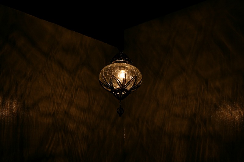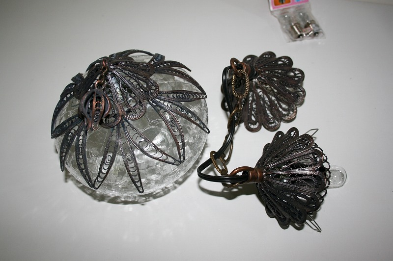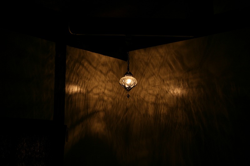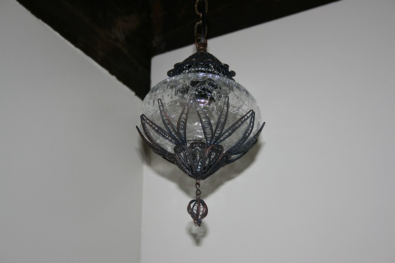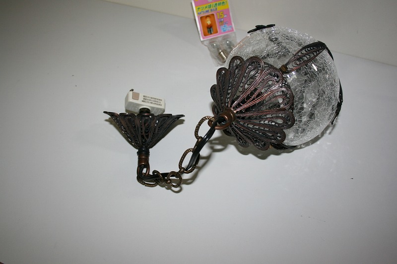 トルコのクラックガラスで、周りの飾りの部分の銅は手作りです。つけた時に ガラスの模様が壁に映るとエキゾチックな雰囲気が味わえます。ガラスの上部がねじ式になっていますので、簡単に 取り付けられます。(ひっかけシーリングの設定になっていますので、取り付けは簡単にできます。)