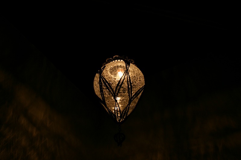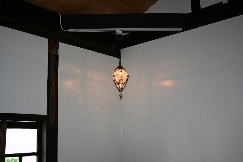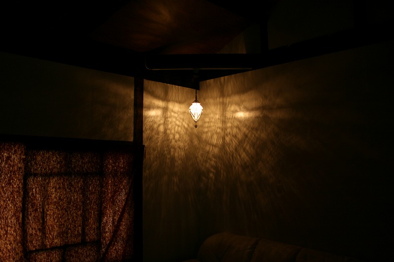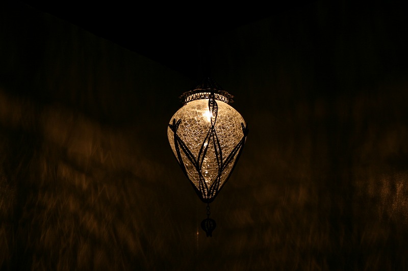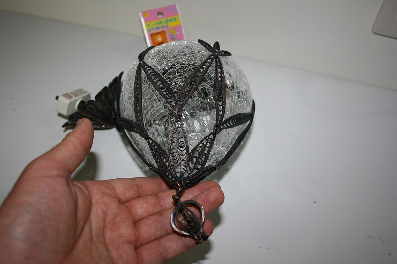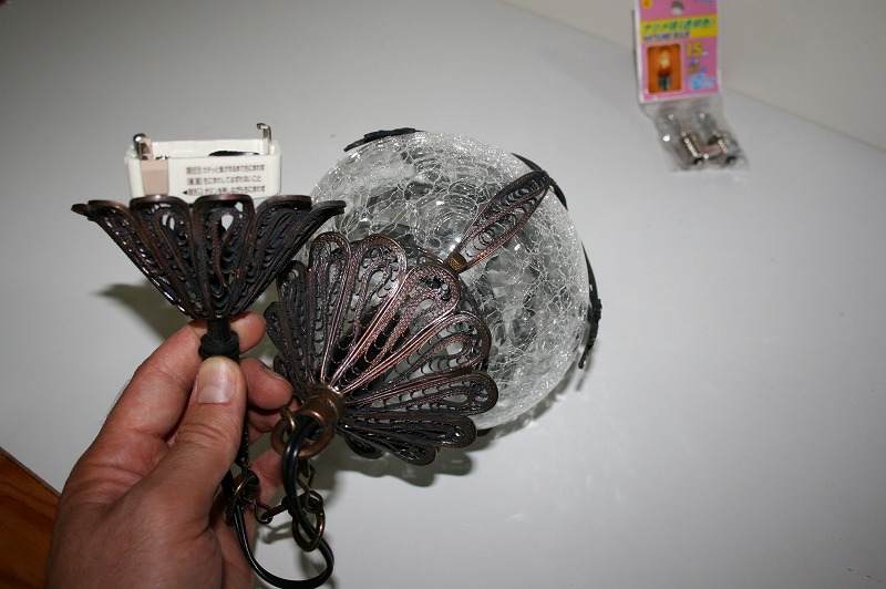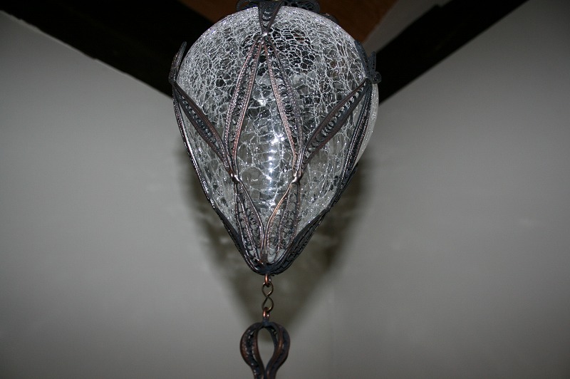 トルコのクラックガラスで、周りの飾りの部分の銅は手作りです。つけた時に ガラスの模様が壁に映るとエキゾチックな雰囲気が味わえます。ガラスの上部がねじ式になっていますので、簡単に 取り付けられます。(ひっかけシーリングの設定になっていますので、取り付けは簡単にできます。)