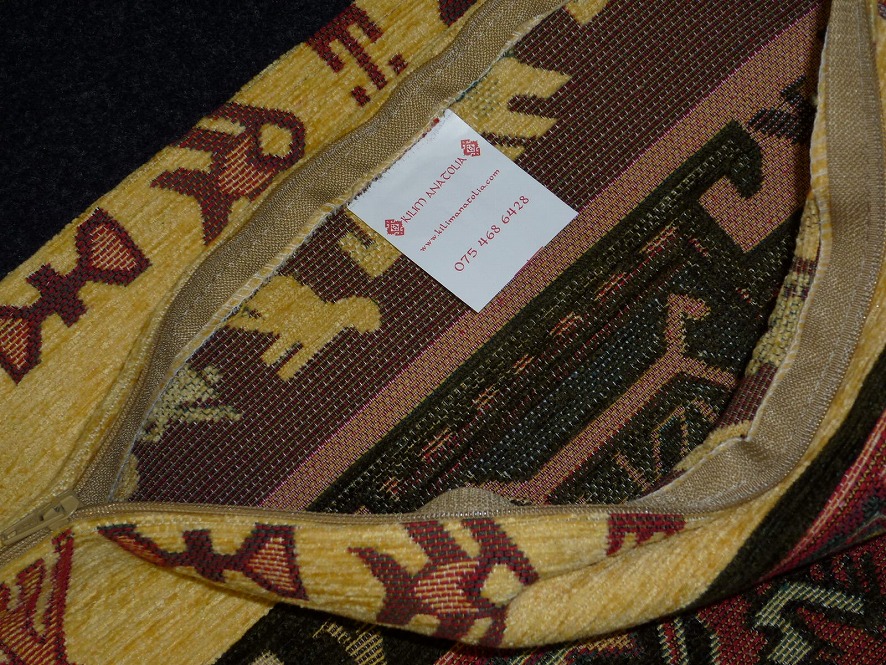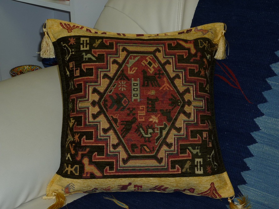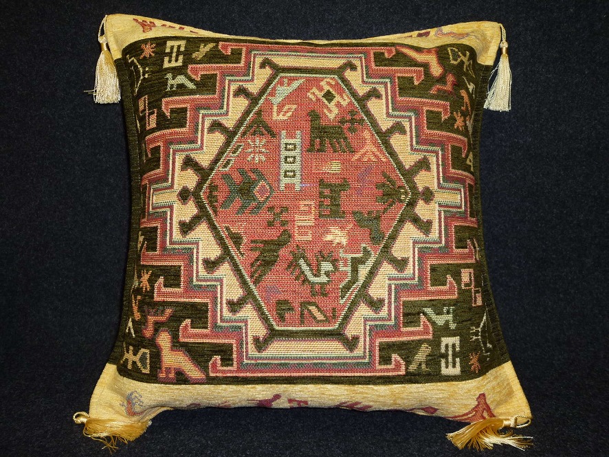 オスマントルコの伝統紋様を、あなたのお部屋に!このシリーズに使用している布地は、キリムではありませんが古くからトルコに伝わっている素晴らしいデザ インを、クッションカバーに取り入れたファブリック製品です。エキゾチックなトルコ製のクッションカバーを、あなたのお部屋に!古くからトルコに伝わる、 伝統のデザイン・モチーフを織り込んであります。デザインの豪華さ、手軽に洗濯のできる丈夫さ、そしてこのリーズナブルなプライス、どれをとっても大満 足!