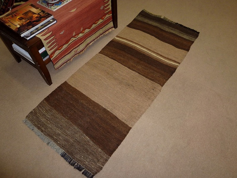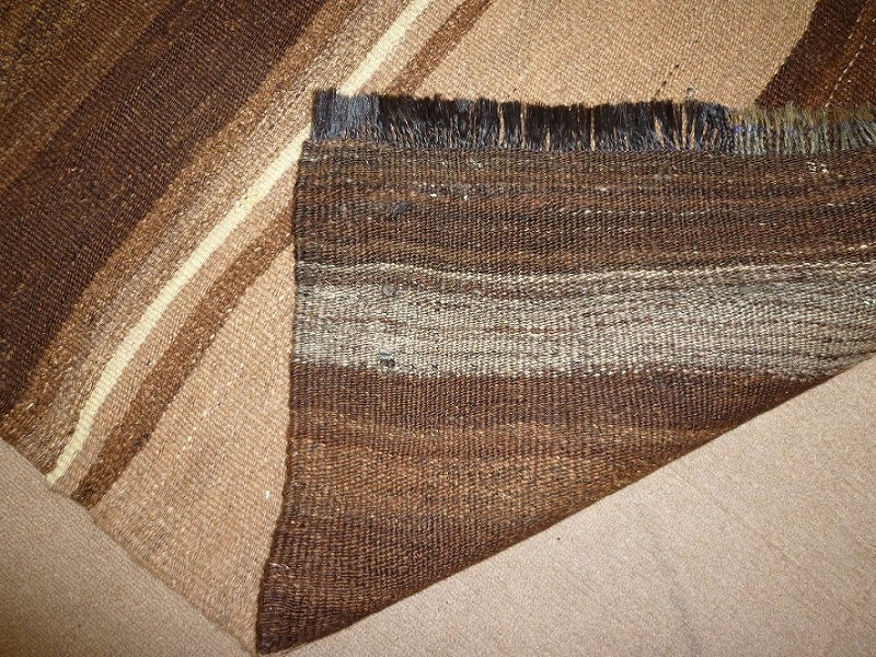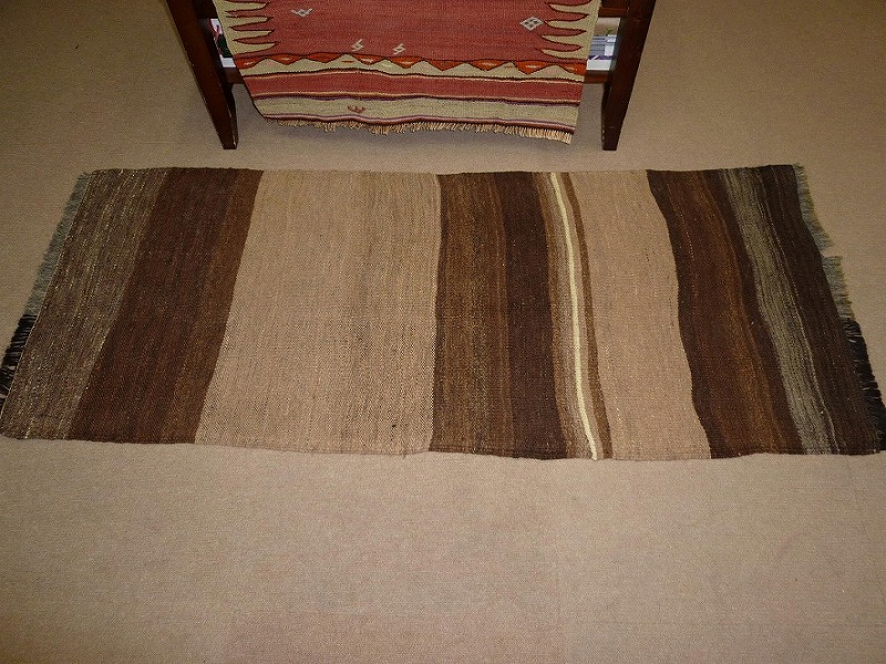 [cuv08]小麦や豆など大切なものを入れるために織られたキリム。このキリムは、袋の裏側に当たる部分です。染めていない羊毛の色を生かして織られており、自然な羊毛の濃淡を楽しめる一品です。モダンな色合いで、合わせやすいキリム。しっかりとした織りで、比較的よごれにくいので、いろいろな場所にお使いいただけます。使われた様子はなく、ほとんどダメージはありません。ふさの根元の部分は、横糸が出てこないように丁寧に仕上げています。リーズナブルなプライスでご満足いただけると思います。