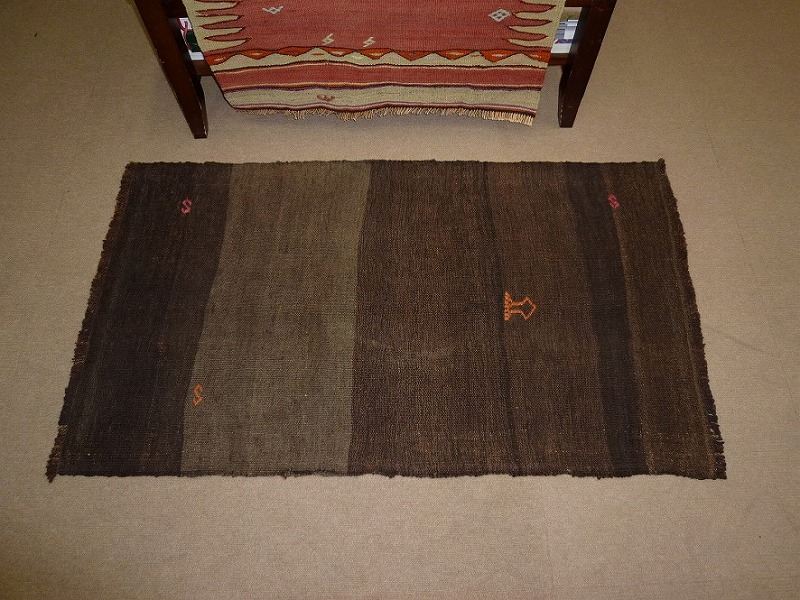 [cuv10]小麦や豆など大切なものを入れるために織られたキリム。このキリムは、袋の裏側に当たる部分です。染めていない羊毛の色を生かして織られており、自然な羊毛の濃淡を楽しめる一品です。モダンな色合いで、合わせやすいキリム。しっかりとした織りで、比較的よごれにくいので、いろいろな場所にお使いいただけます。使われた様子はなく、ほとんどダメージはありません。ふさの根元の部分は、横糸が出てこないように丁寧に仕上げています。リーズナブルなプライスでご満足いただけると思います。