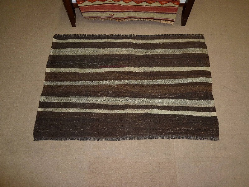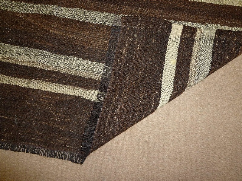 [cuv13]小麦や豆など大切なものを入れるために織られたキリム。このキリムは、袋の裏側に当たる部分です。染めていない羊毛の色を生かして織られており、自然な羊毛の濃淡を楽しめる一品です。モダンな色合いで、合わせやすいキリム。しっかりとした織りで、比較的よごれにくいので、いろいろな場所にお使いいただけます。使われた様子はなく、ほとんどダメージはありません。ふさの根元の部分は、横糸が出てこないように丁寧に仕上げています。リーズナブルなプライスでご満足いただけると思います。