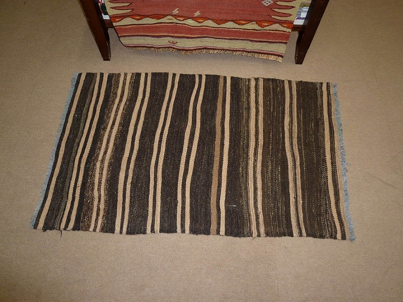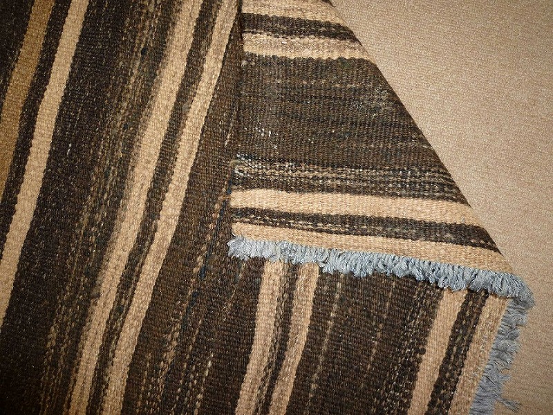 [cuv19]小麦や豆など大切なものを入れるために織られたキリム。このキリムは、袋の裏側に当たる部分です。染めていない羊毛の色を生かして織られており、自然な羊毛の濃淡を楽しめる一品です。モダンな色合いで、合わせやすいキリム。しっかりとした織りで、比較的よごれにくいので、いろいろな場所にお使いいただけます。使われた様子はなく、ほとんどダメージはありません。ふさの根元の部分は、横糸が出てこないように丁寧に仕上げています。リーズナブルなプライスでご満足いただけると思います。