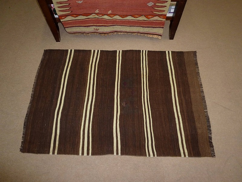 [cuv25]小麦や豆など大切なものを入れるために織られたキリム。このキリムは、袋の裏側に当たる部分です。染めていない羊毛の色を生かして織られており、自然な羊毛の濃淡を楽しめる一品です。モダンな色合いで、合わせやすいキリム。しっかりとした織りで、比較的よごれにくいので、いろいろな場所にお使いいただけます。使われた様子はなく、ほとんどダメージはありません。ふさの根元の部分は、横糸が出てこないように丁寧に仕上げています。リーズナブルなプライスでご満足いただけると思います。