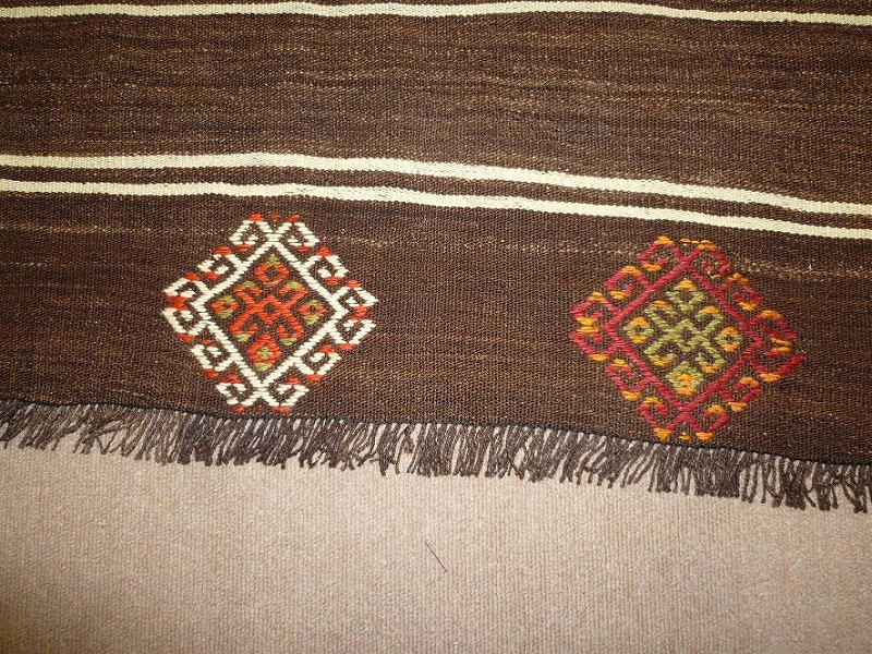 [cuv26]小麦や豆など大切なものを入れるために織られたキリム。このキリムは、袋の裏側に当たる部分です。染めていない羊毛の色を生かして織られており、自然な羊毛の濃淡を楽しめる一品です。モダンな色合いで、合わせやすいキリム。しっかりとした織りで、比較的よごれにくいので、いろいろな場所にお使いいただけます。使われた様子はなく、ほとんどダメージはありません。ふさの根元の部分は、横糸が出てこないように丁寧に仕上げています。リーズナブルなプライスでご満足いただけると思います。