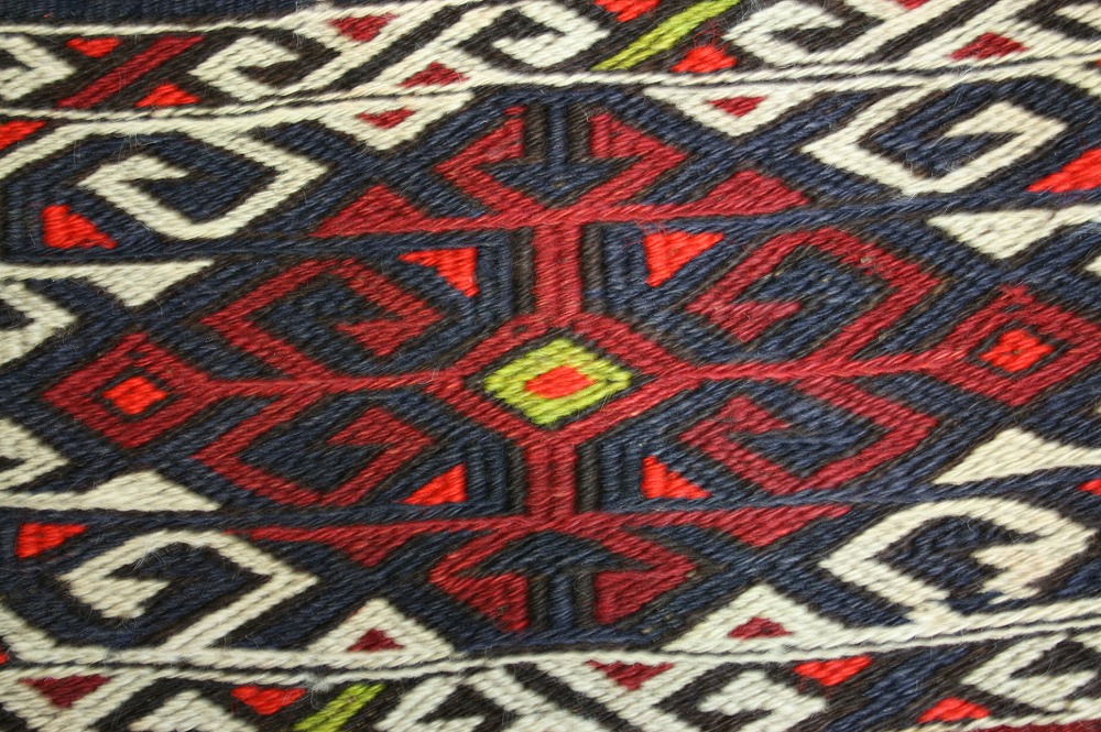 こちらはすばらしいジジムチュワルで、収納袋を開いたキリムです。すべて天然染料の草木染で、手織りで作られたものです。
