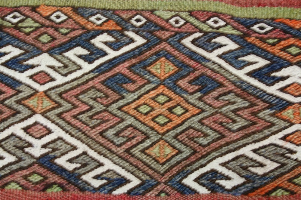 こちらはすばらしいジジムチュワルで、収納袋を開いたキリムです。すべて天然染料の草木染で、手織りで作られたものです。
