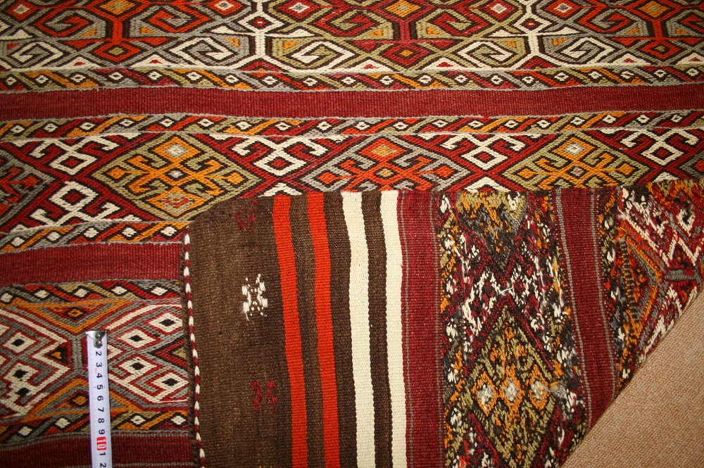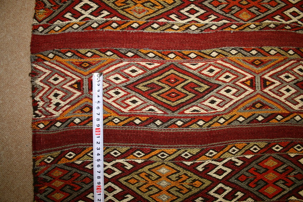 こちらはすばらしいジジムチュワルで、収納袋を開いたキリムです。すべて天然染料の草木染で、手織りで作られたものです。厚みがあり、とてもしっかりしています。袋として使われたもので、床では使われていないため、織ってから50~60年経っていますがきれいな状態を保っています。古いキリムですので、色に味があり、手触りもやわらかくなってきています。サイズ的に壁に飾ってもいい感じです。このタイプのものは、なかなか数が少なく、品質・価格・品揃え共に、日本国内屈指で あると自負しています。