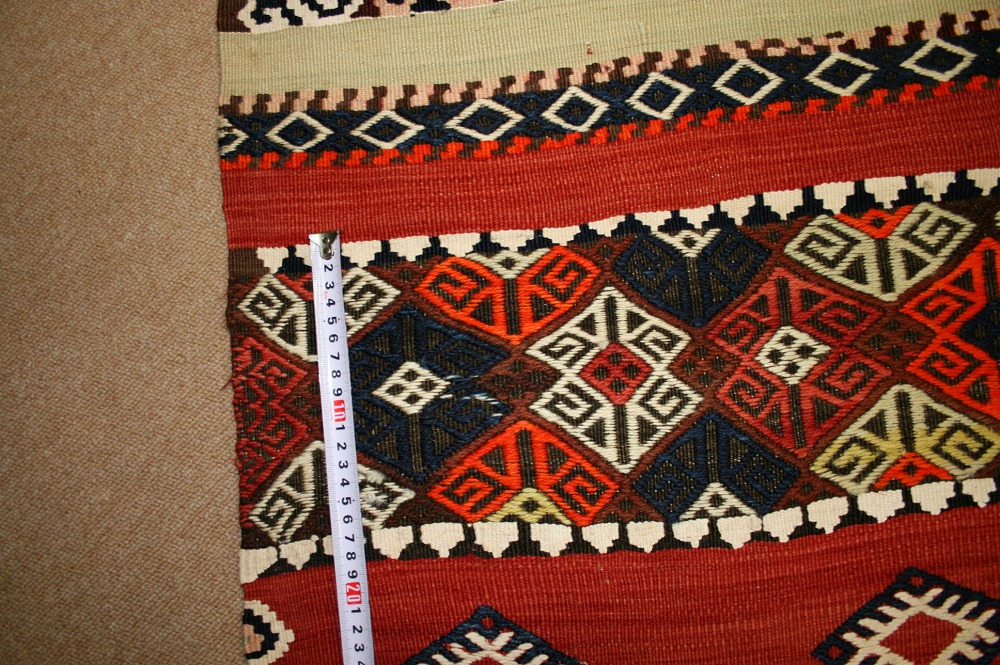 50~60年前のものです。繊細な織りと、大胆なデザインデと色彩。一枚あるだけで、オリジナリティあふれる空間をつくり出してくれます。本キリムに使用の糸は、すべて草木染めです。機械織りとは異なり、暖かみが伝わるハンドメイドです。サイズ的に壁に飾ってもいい感じです。このタイプのものは、なかなか数が少なく、品質・価格・品揃え共に、日本国内屈指で あると自負しています。
