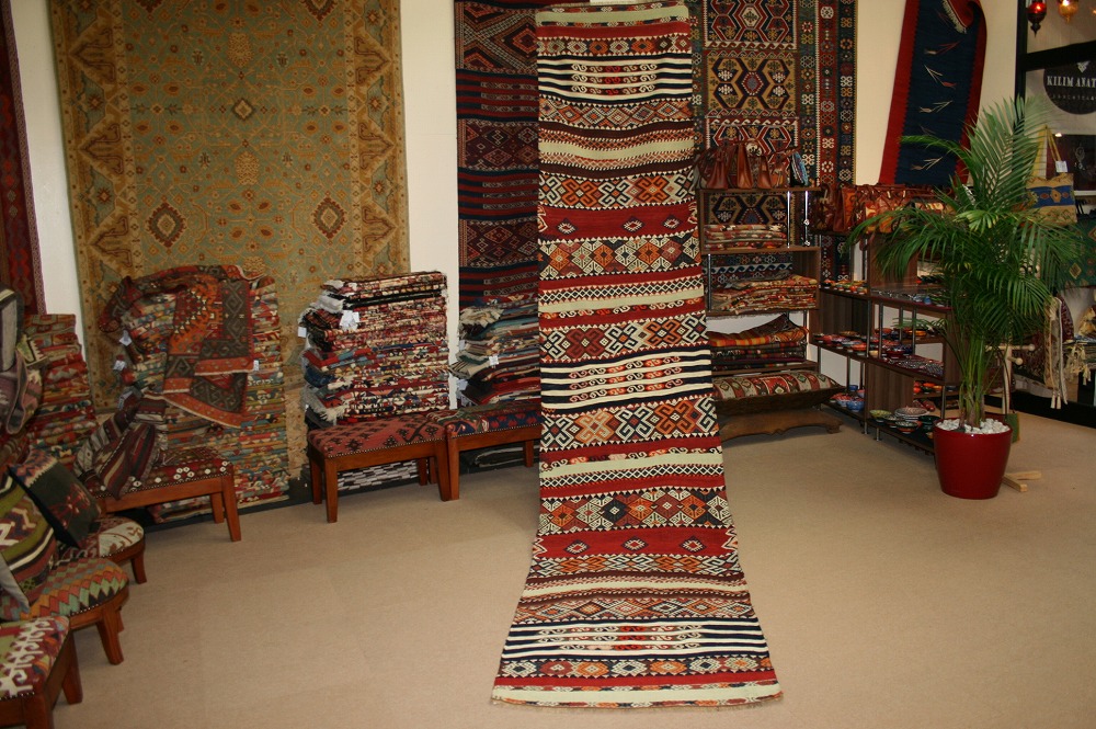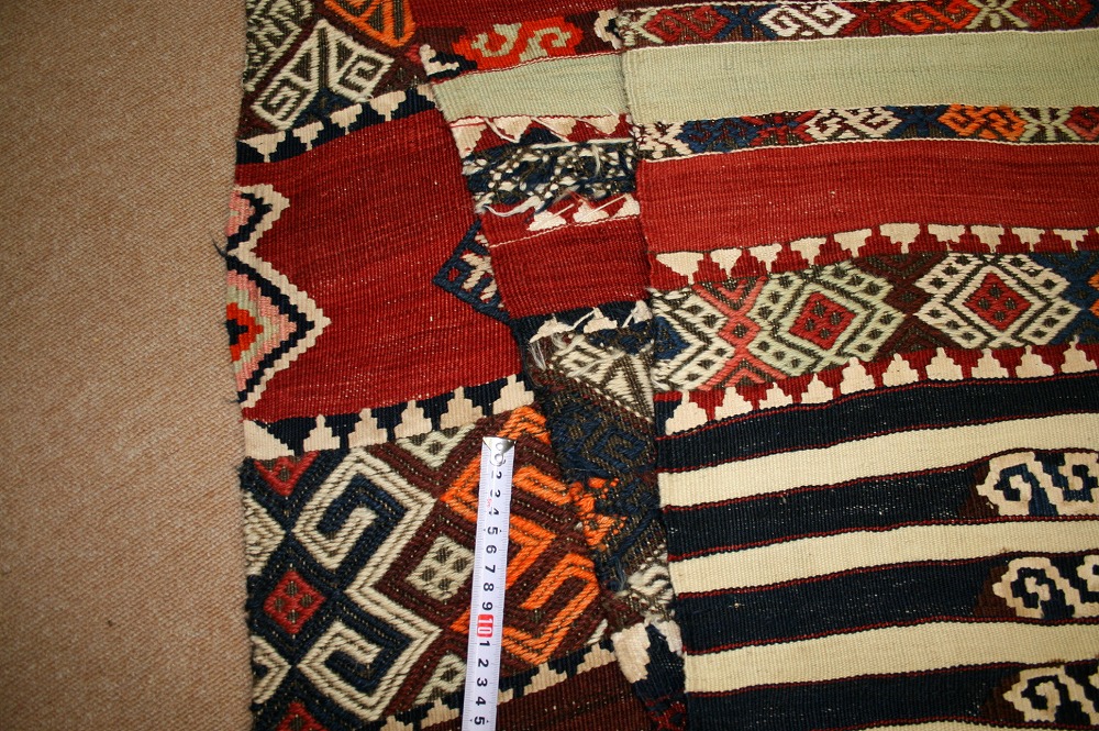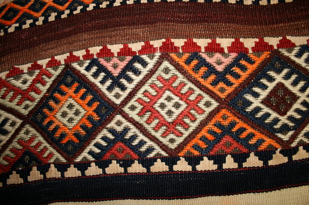 50~60年前のものです。繊細な織りと、大胆なデザインデと色彩。一枚あるだけで、オリジナリティあふれる空間をつくり出してくれます。本キリムに使用の糸は、すべて草木染めです。機械織りとは異なり、暖かみが伝わるハンドメイドです。サイズ的に壁に飾ってもいい感じです。このタイプのものは、なかなか数が少なく、品質・価格・品揃え共に、日本国内屈指で あると自負しています。