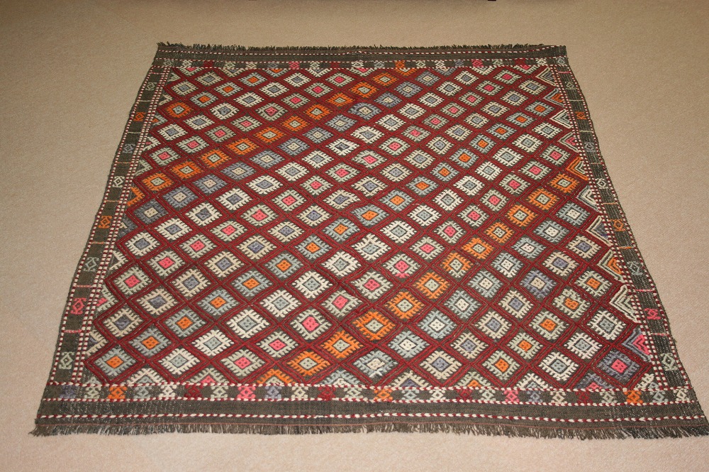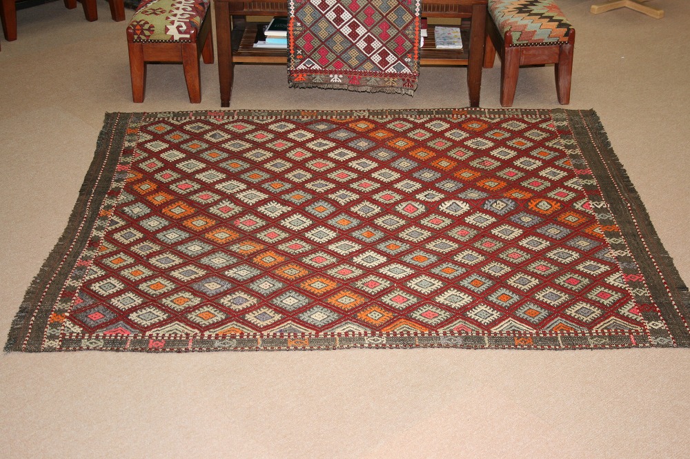 50~60年前のものです。繊細な織りと、大胆なデザインデと色彩。一枚あるだけで、オリジナリティあふれる空間をつくり出してくれます。本キリムに使用の糸は、すべて草木染めです。機械織りとは異なり、暖かみが伝わるハンドメイドです。