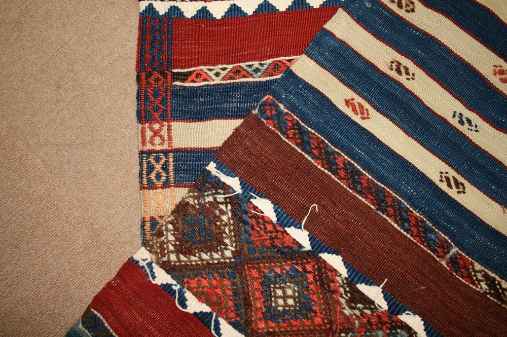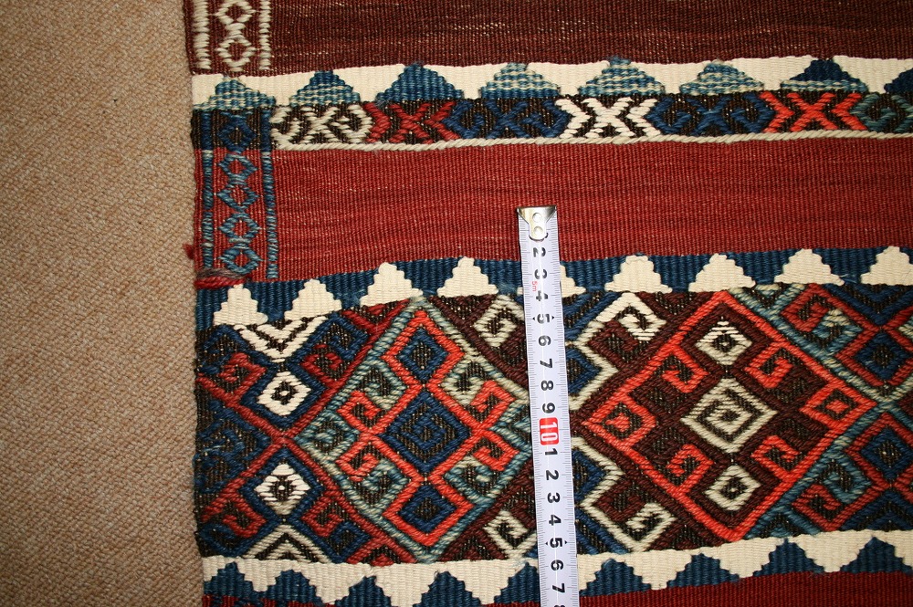 50~60年前のものです。繊細な織りと、大胆なデザインデと色彩。一枚あるだけで、オリジナリティあふれる空間をつくり出してくれます。本キリムに使用の糸は、すべて草木染めです。機械織りとは異なり、暖かみが伝わるハンドメイドです。サイズ的に壁に飾ってもいい感じです。このタイプのものは、なかなか数が少なく、品質・価格・品揃え共に、日本国内屈指で あると自負しています。